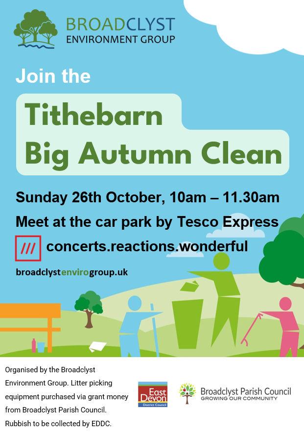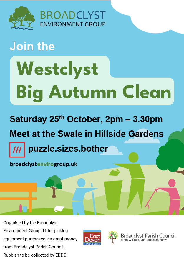 - Broadclyst: 10am – 11.30am on Saturday 1st November 2025. Meet by the Sports Pavilion (what3words: skyrocket.uproot.tiny).