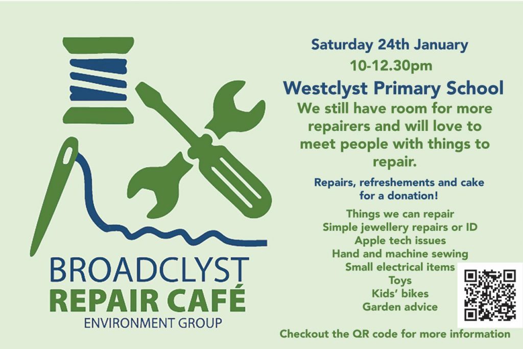 Come along to Broadclyst parish’s first repair café, which is taking place on Saturday 24th January 2026, between 10 am and 12.30 pm at Westclyst Primary School, Maddick Road, Westclyst, EX1 3YG.
